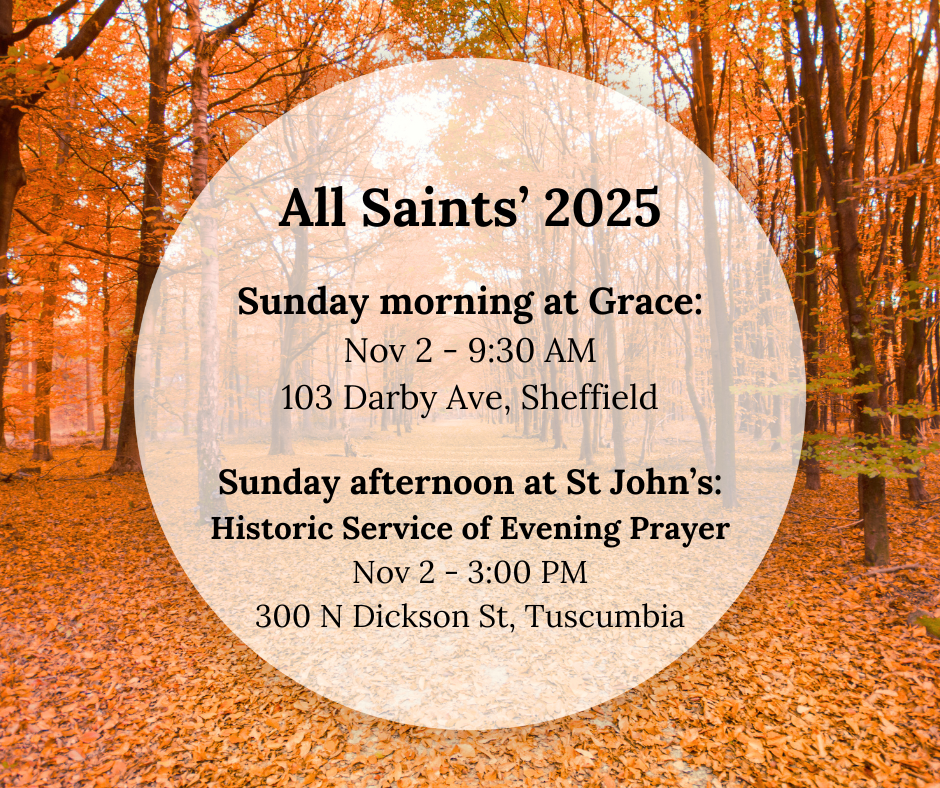Every November, Christians throughout the world pause to remember and give thanks for “those we love, but see no longer.” Grace celebrates this tradition on the first Sunday in November with Holy Communion, during which we read the names of departed loved ones. Later that day, we host a community prayer service, using a historic liturgy, at St. John’s in Tuscumbia. All are invited to and welcome at both services- these are not “member only” events!